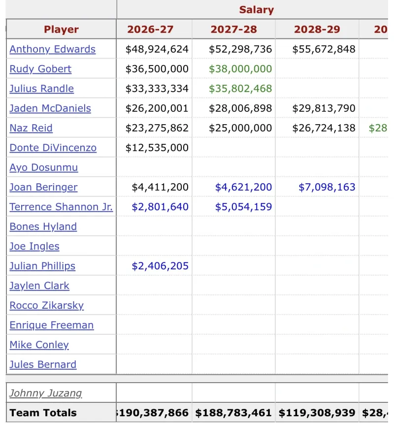 在完成一系列操作后,森林狼下个赛季在某种程度上已经达到了阵容实力和薪资健康的完美平衡。球队主要球员中,只有爱德华兹的薪资超过了4500万美元,戈贝尔和兰德尔的薪资都低于4000万美元,同时二人的合同也将在两个赛季结束后到期。