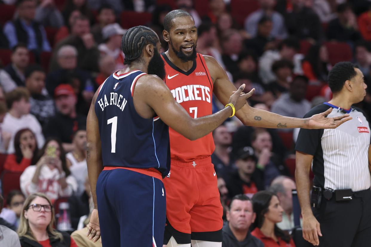 下一场比赛,火箭队的对手是金州勇士队。上赛季火箭队就败在了勇士队手里,在季后赛里第1轮就被淘汰出局。其实那时候火箭队可是西部第二,但是对阵西部第七,火箭队最终在抢七大战当中被对手淘汰,只能饮恨出局。火箭队肯定还憋着一口气,所以他们在本赛季升级了阵容,他们将后卫杰伦·格林和小前锋狄龙·布鲁克斯打包送到了太阳队,换来了太阳队37岁的顶级巨星凯文·杜兰特。
